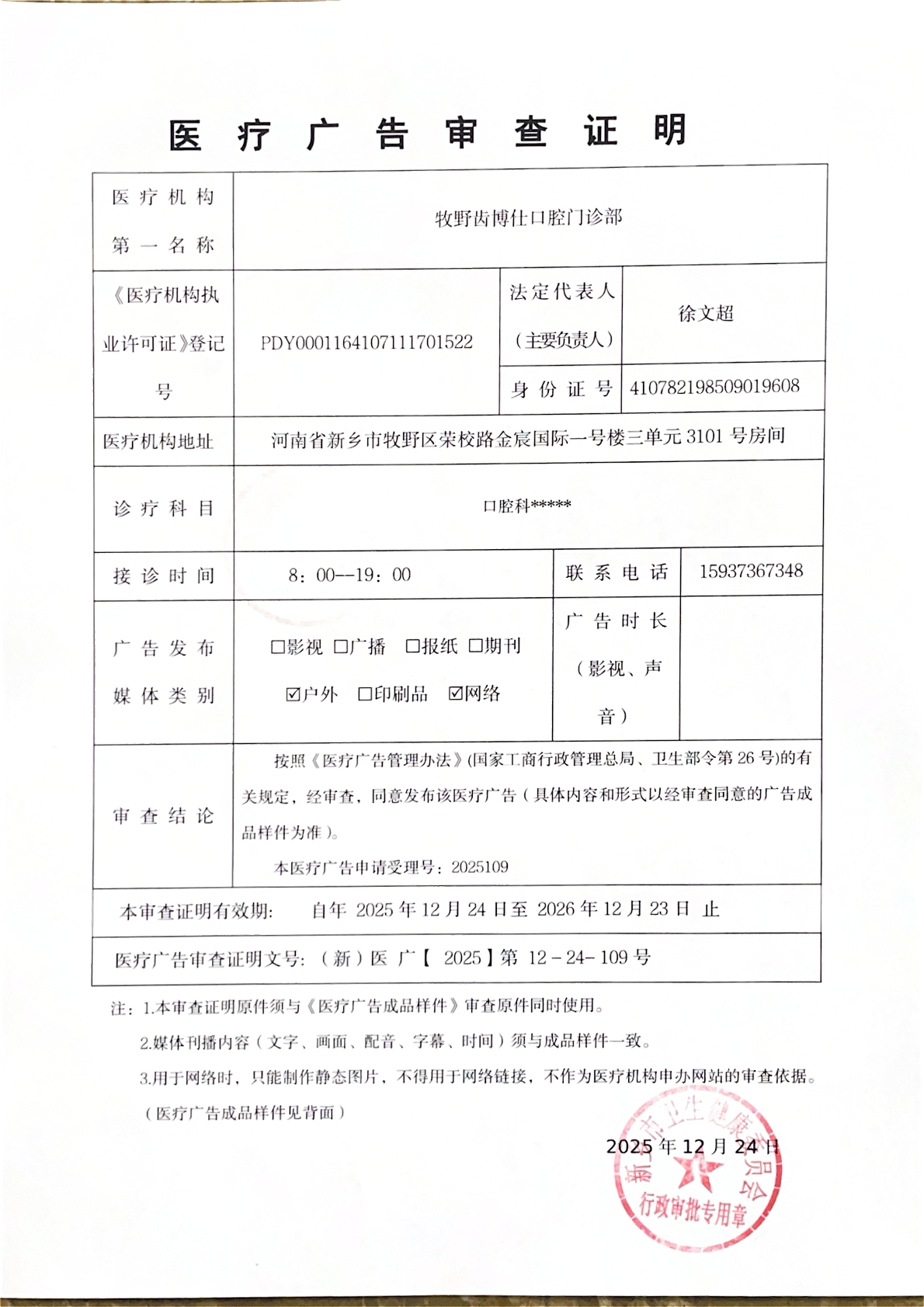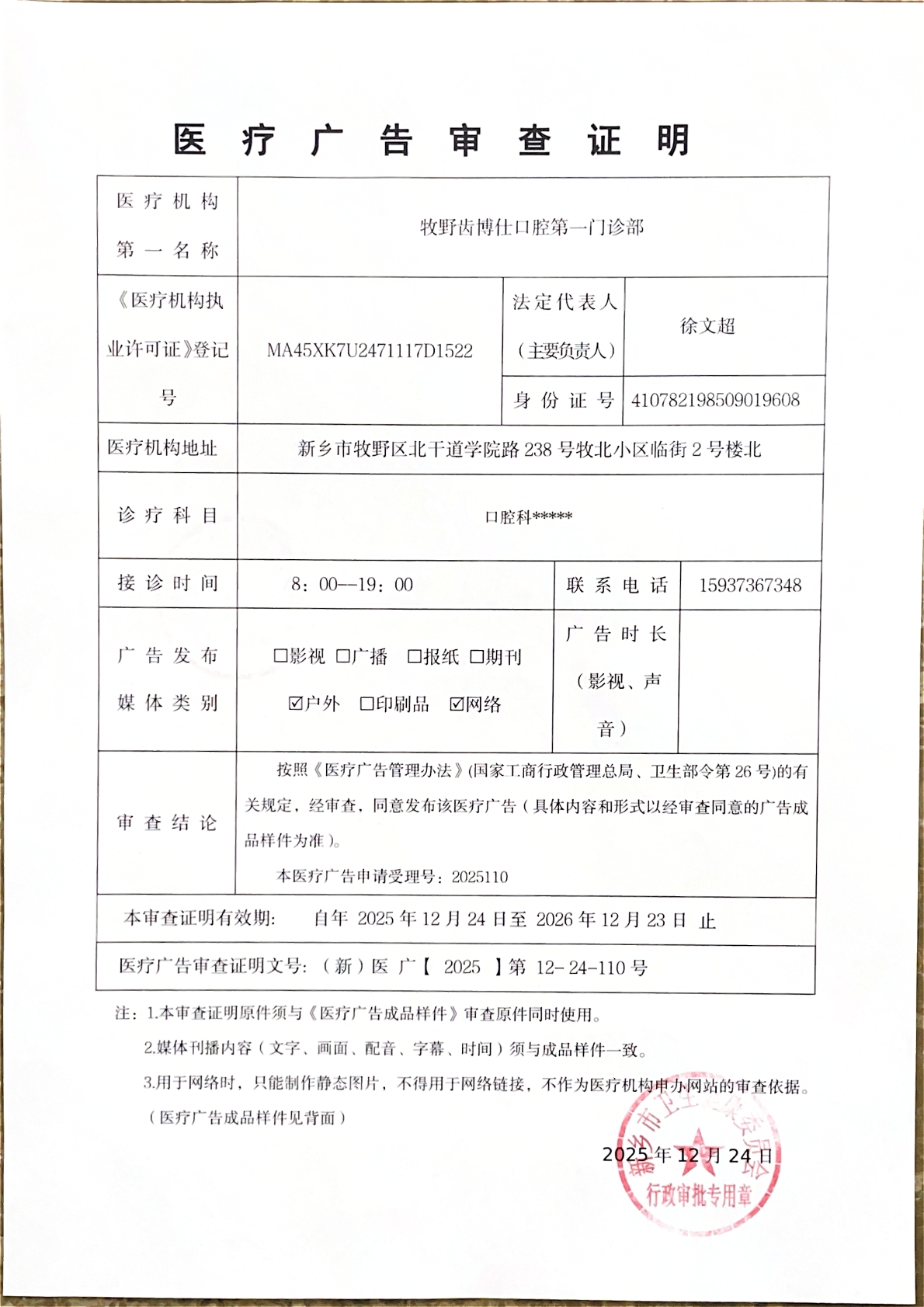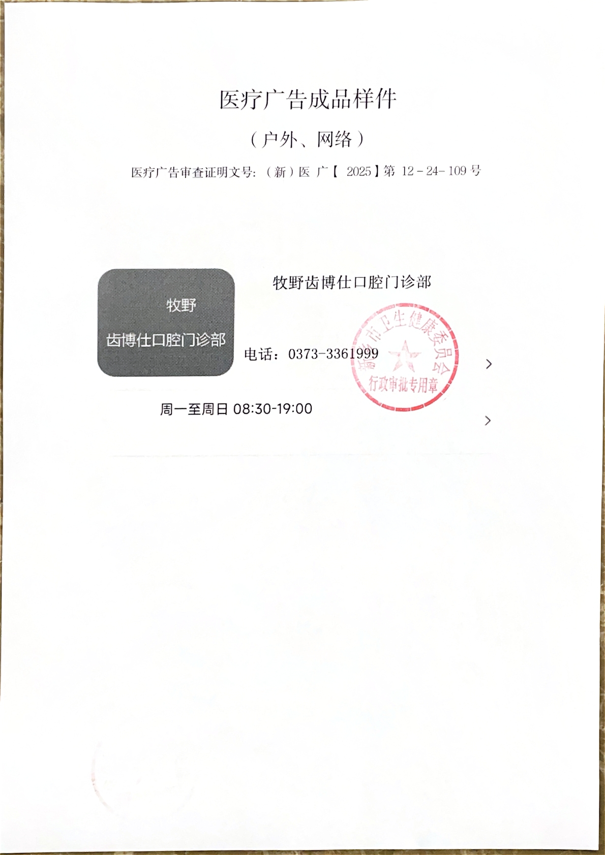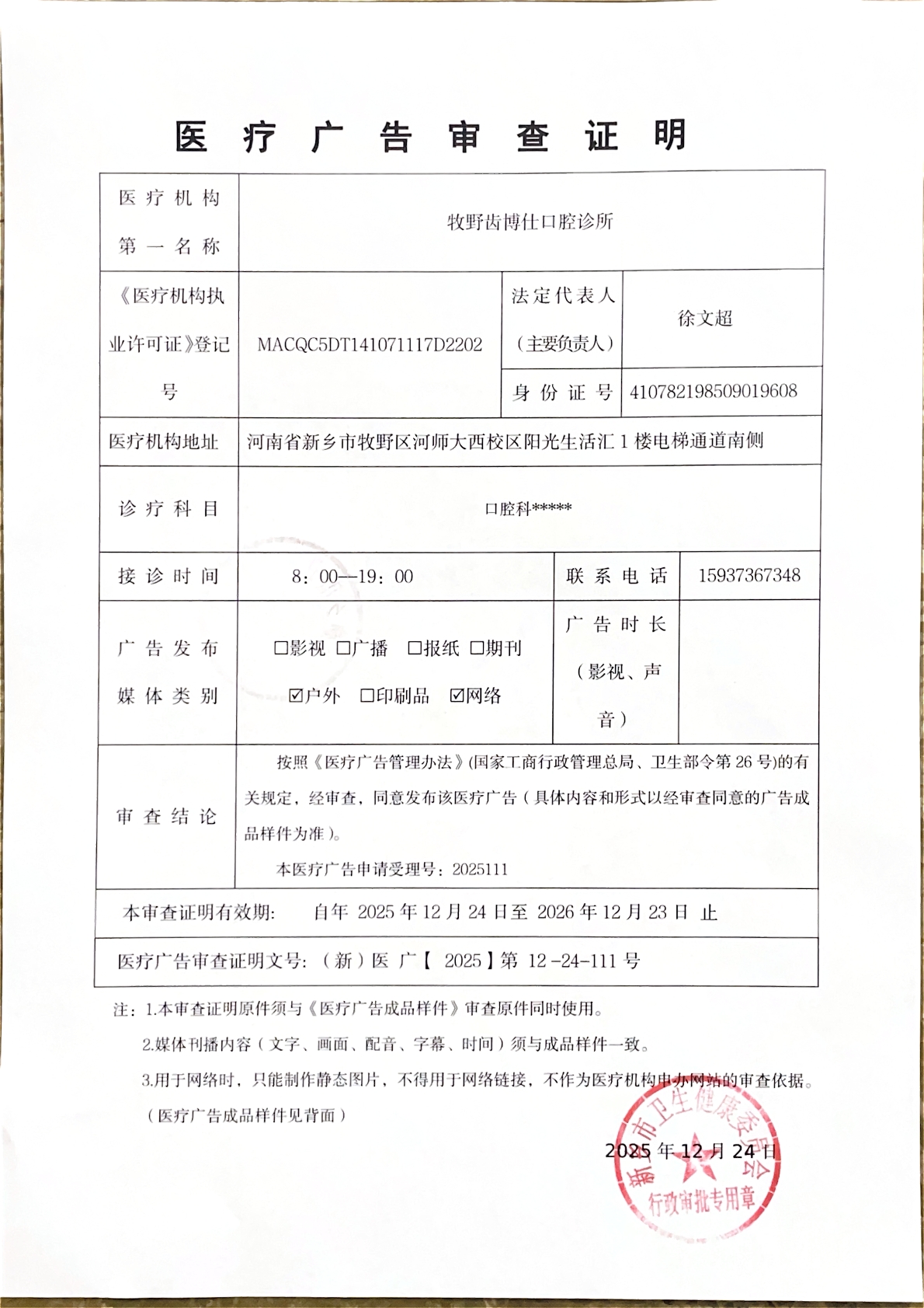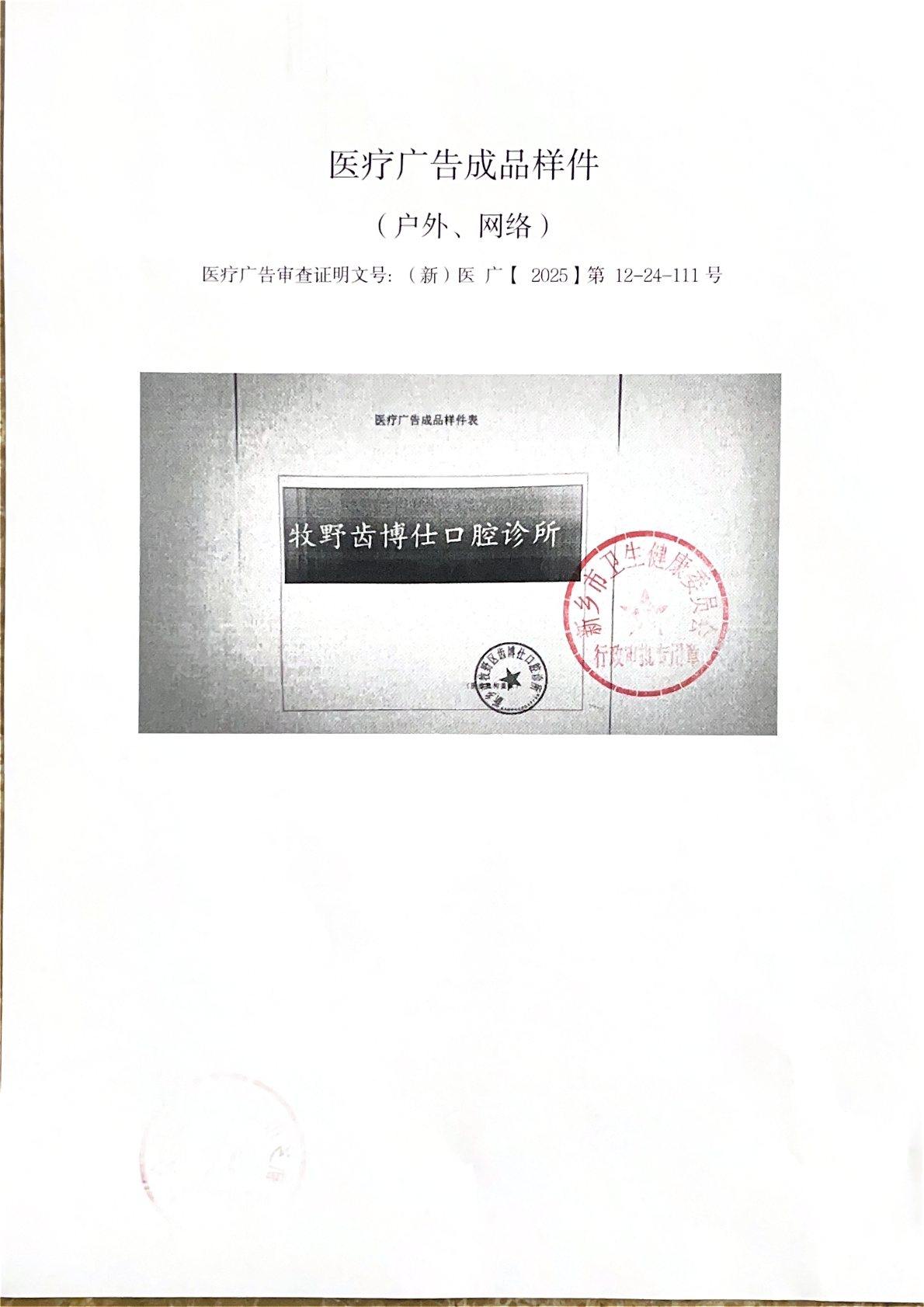 | (新)医广【2025】第12-24-110号 | 医疗广告审查证明 | 核准 | 户外、网络 | 牧野齿博仕口腔第一门诊部 | 个体工商户 | 徐** | 身份证 | 41078***********08 | 医疗广告审查证明 | (新)医广【2025】第12-24-110号 | 2025/12/24 | 2025/12/24 | 2026/12/23 | 新乡市卫生健康委员会 | 11410700MB0U017726 | 1 | 新乡市卫生健康委员会 | 11410700MB0U017726 | 1 | |||||||||