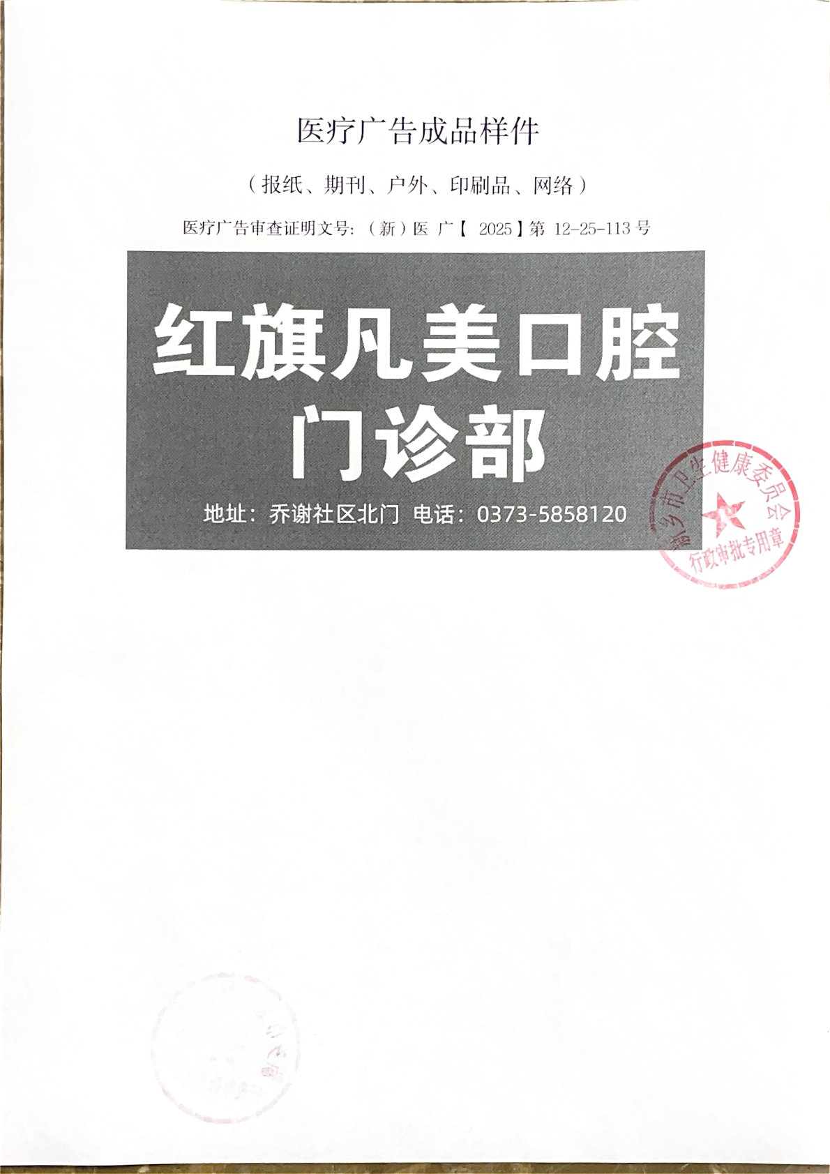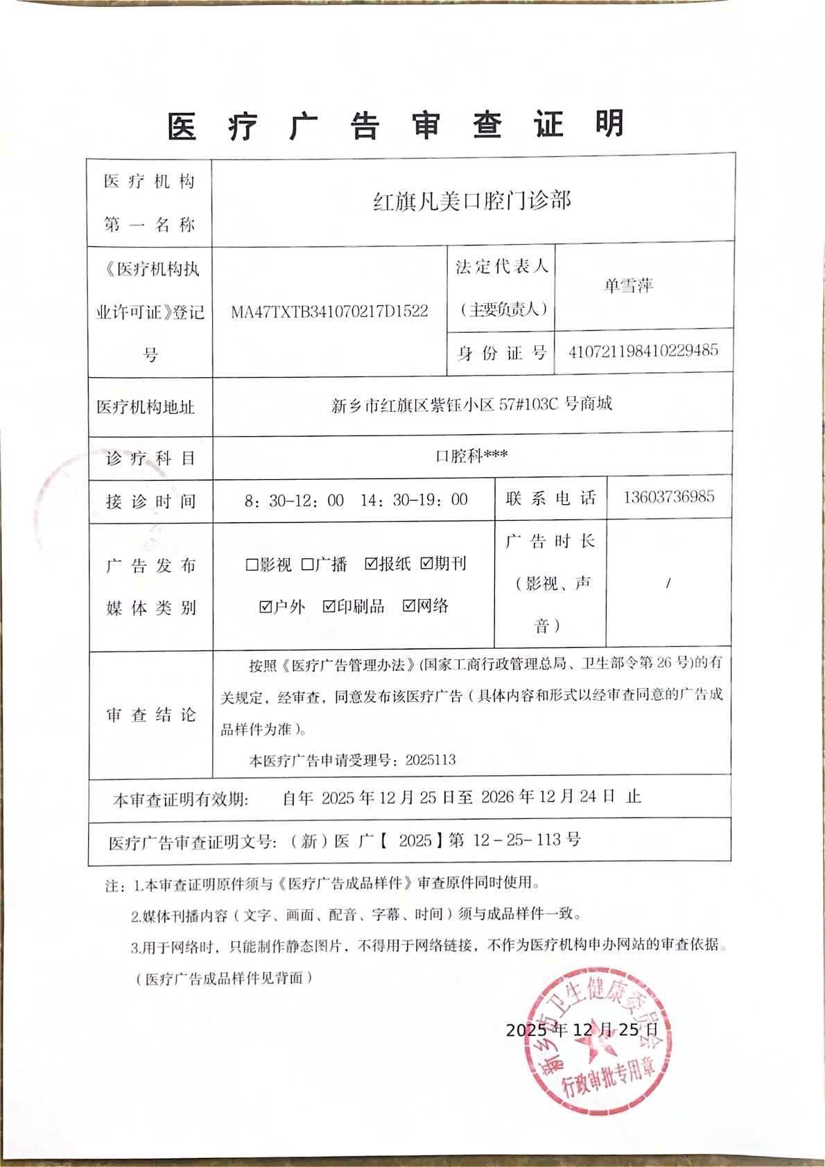 | (新)医广【2025】第12-25-113号 | 医疗广告审查证明 | 核准 | 期刊、户外、印刷品、网络 | 红旗凡美口腔门诊部 | 法人及非法人组织 | 91410702MA47TXTB3L | 单** | 身份证 | 41072***********85 | 医疗广告审查证明 | (新)医广【2025】第12-25-113号 | 2025/12/25 | 2025/12/25 | 2026/12/24 | 新乡市卫生健康委员会 | 11410700MB0U017726 | 1 | 新乡市卫生健康委员会 | 11410700MB0U017726 | 1 | ||||||||