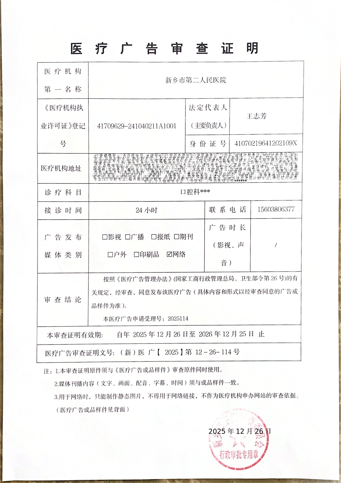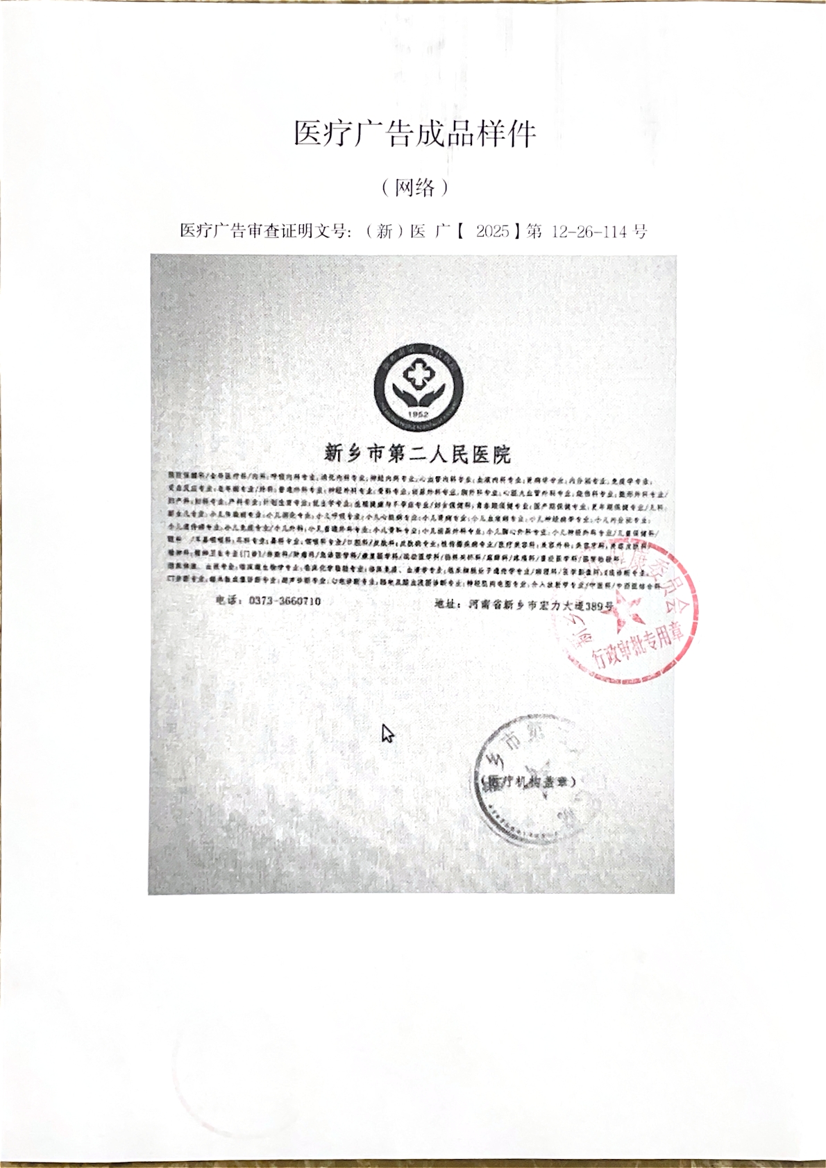 | (新)医广【2025】第12-26-114号 | 医疗广告审查证明 | 核准 | 网络 | 新乡市第二人民医院 | 法人及非法人组织 | 12410700417086292T | 王** | 身份证 | 41070***********9X | 医疗广告审查证明 | (新)医广【2025】第12-26-114号 | 2025/12/26 | 2025/12/26 | 2026/12/25 | 新乡市卫生健康委员会 | 11410700MB0U017726 | 1 | 新乡市卫生健康委员会 | 11410700MB0U017726 | 1 |