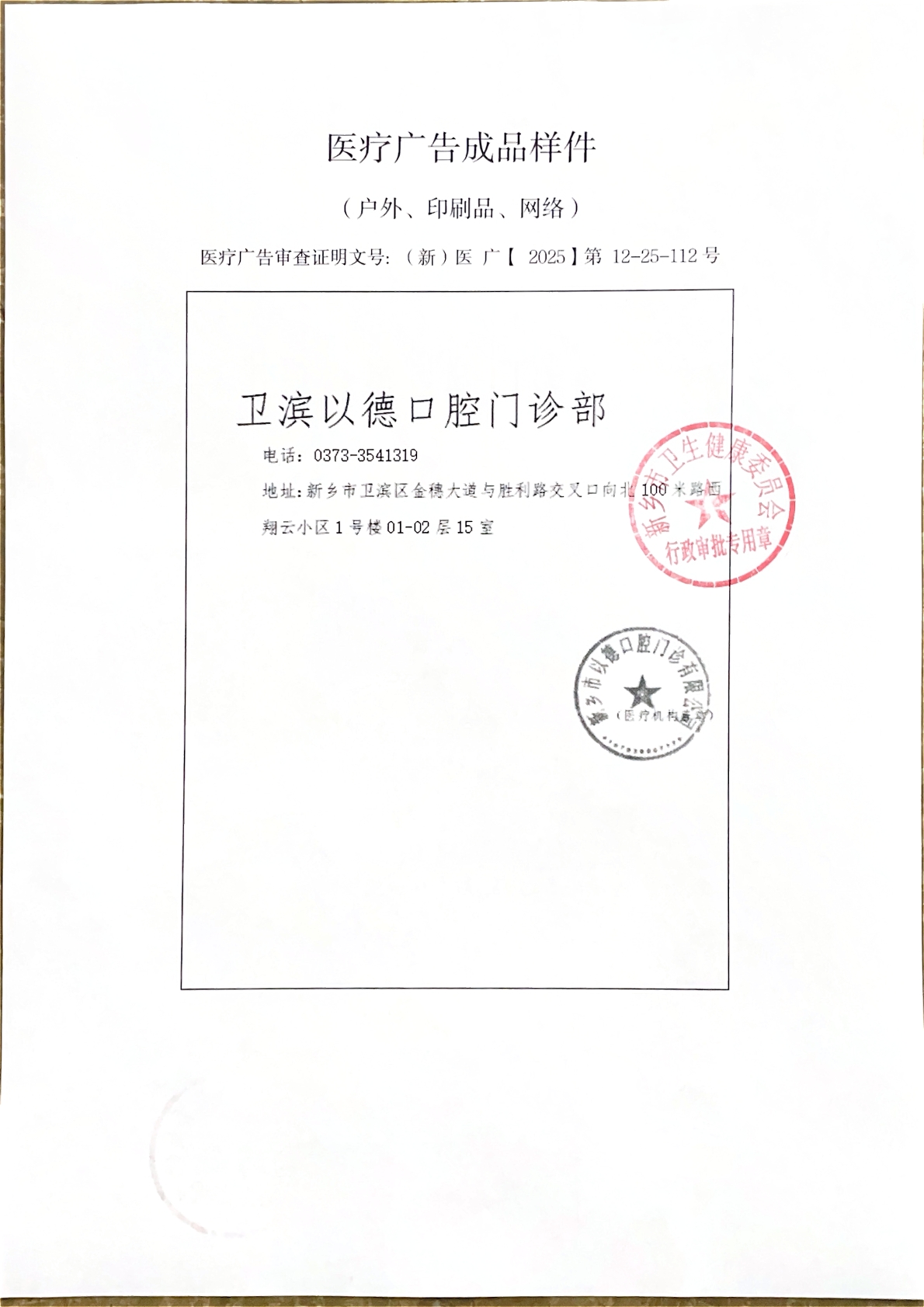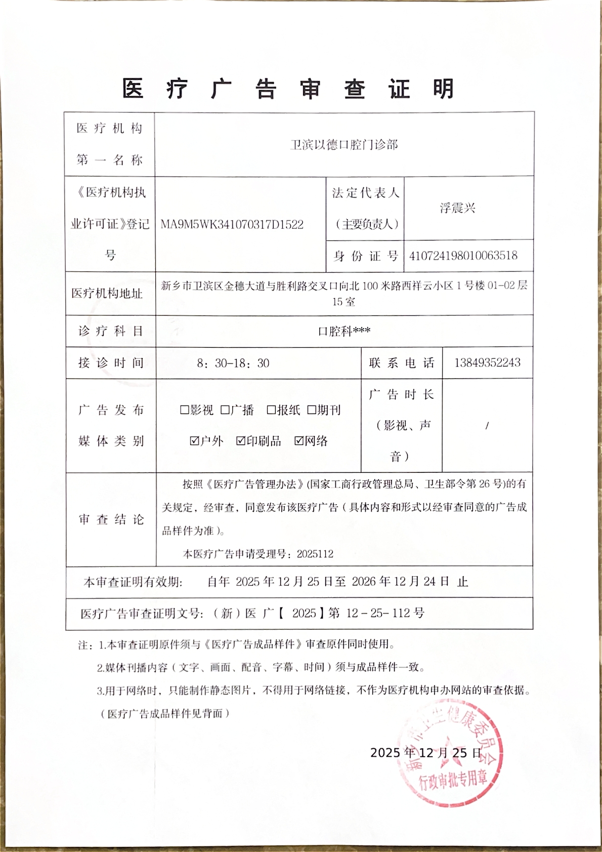 | (新)医广【2025】第12-25-112号 | 医疗广告审查证明 | 核准 | 户外、印刷品、网络 | 卫滨以德口腔门诊部 | 法人及非法人组织 | 91410703MA9M5W5K3D | 浮** | 身份证 | 41072***********18 | 医疗广告审查证明 | (新)医广【2025】第12-25-112号 | 2025/12/25 | 2025/12/25 | 2026/12/24 | 新乡市卫生健康委员会 | 11410700MB0U017726 | 1 | 新乡市卫生健康委员会 | 11410700MB0U017726 | 1 | ||||||||