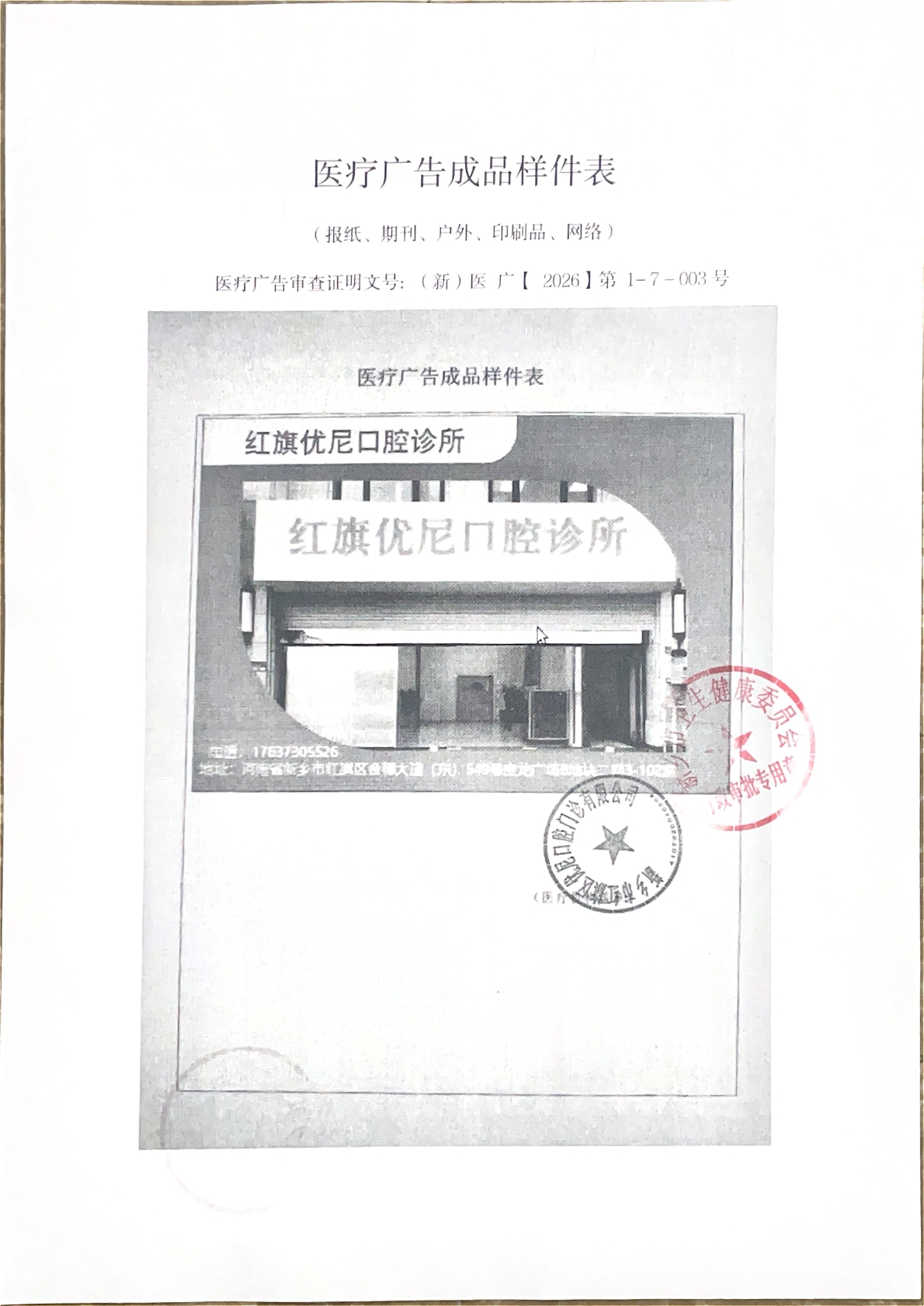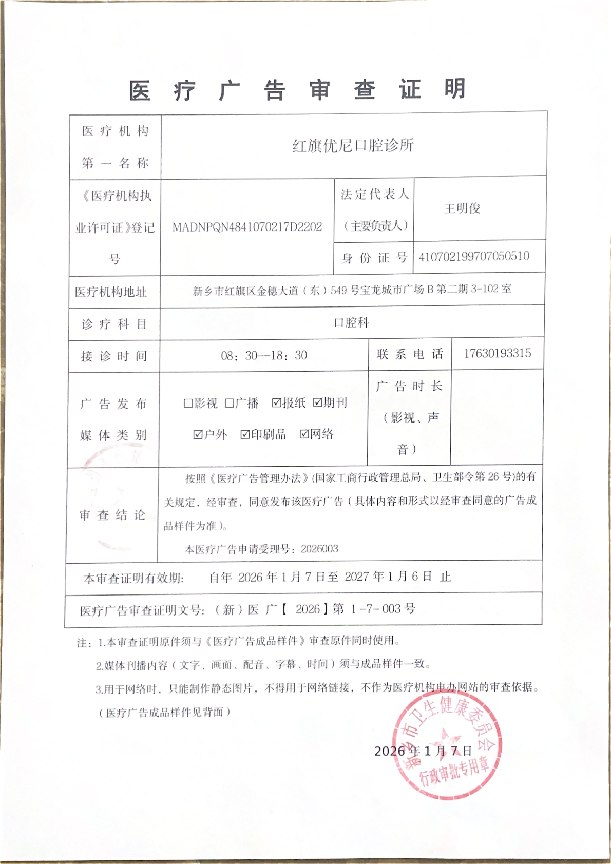 | 医疗广告审查证明 | 核准 | 报纸、期刊、户外、印刷品、网络 | 红旗优尼口腔诊所 | 法人及非法人组织 | 王** | 身份证 | 41070***********10 | 医疗广告审查证明 | 2026/1/7 | 2026/1/7 | 2027/1/6 | 新乡市卫生健康委员会 | 11410700MB0U017726 | 1 | 新乡市卫生健康委员会 | 11410700MB0U017726 | 1 |